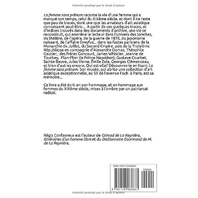 "La femme sans prénom" raconte la vie d’une femme qui a marqué son temps, celui du XIXème siècle, et dont il ne reste que peu de traces, sauf une, que les amateurs d’art asiatique connaissent peut-être. A partir de ces quelques traces, et d'indices trouvés dans des documents d'archive, une vie se reconstruit, qui emmène le lecteur dans l’univers des lorettes, du théâtre, de l’opéra, du japonisme naissant ; dans les fastes parisiens de la Monarchie de Juillet, du Second Empire, puis de la Troisième République en compagnie d’Alexandre Dumas, Théophile Gautier, des frères Goncourt, James Whistler, Jeanne de Tourbey, Plon-Plon (le Prince Napoléon), Gustave Courbet, Sainte-Beuve, Jules Verne, Émile Zola, Georges Clémenceau, et bien d’autres encore. Qui est-elle? Découvrez-le en lisant La femme sans prénom. Son musée, au 59 de l’avenue Foch à Paris est sa mémoire. Ce livre a été écrit en son hommage, et en hommage aux femmes du XIXème siècle, restées dans l’ombre en raison d’un patriarcat radical.